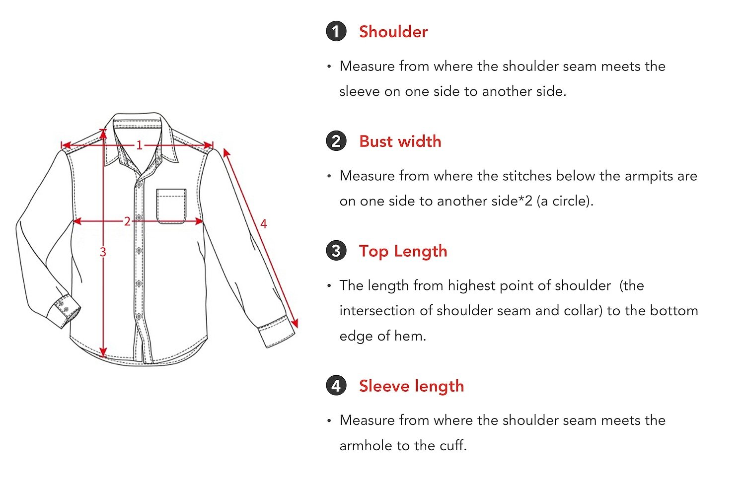 1. Measurements are taken with the garment laying flat. Measurements are approximate - please allow up to a 1/2 tolerance for each measurement.