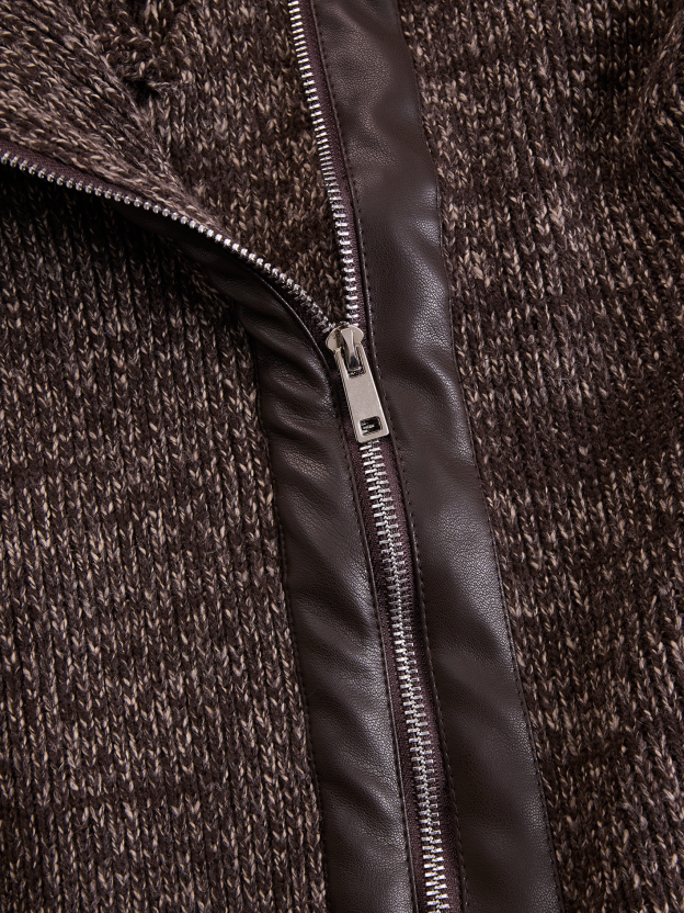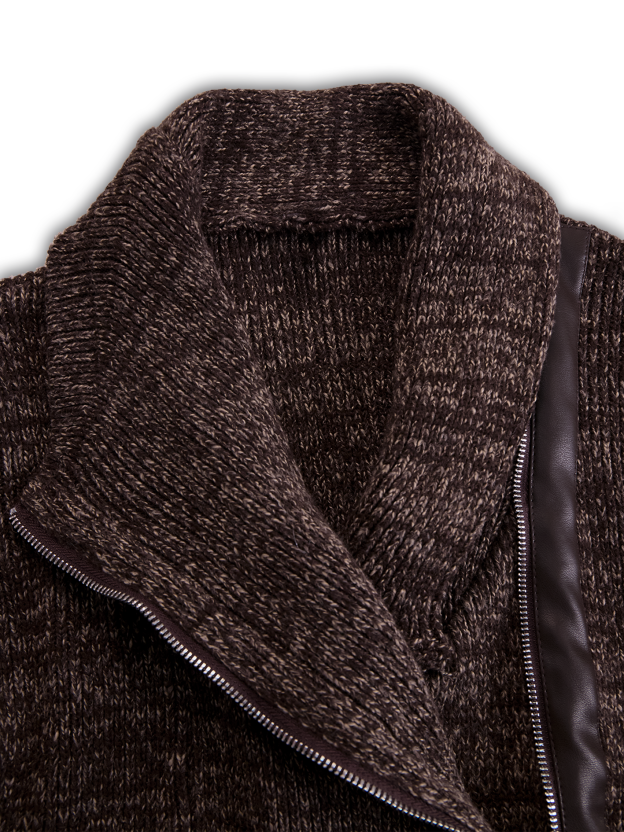 A sleek, fitted knit jacket designed with an asymmetrical front zipper and structured silhouette. The ribbed texture adds depth and dimension, while the rich brown hue offers a timeless and versatile appeal. Featuring a high collar and long sleeves with extended cuffs, this jacket blends casual comfort with edgy sophistication.