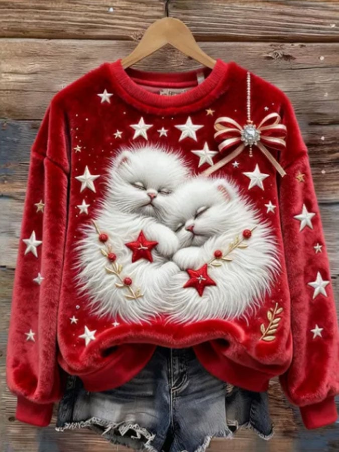 Women's Christmas Sleeping Cats Stars Embroidered Cozy Plush Sweatshirt
